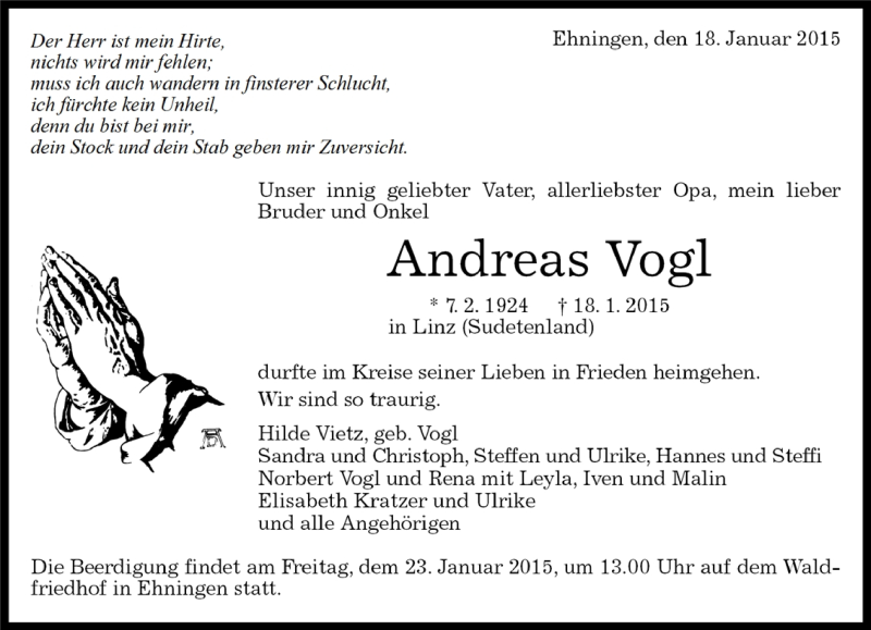 Hier finden Sie alle Traueranzeigen aus der Zeitung, die bisher für Andreas Vogl erschienen sind. Weitere Traueranzeigen, die in der Zeitung erscheinen, werden hier ebenfalls aufgelistet