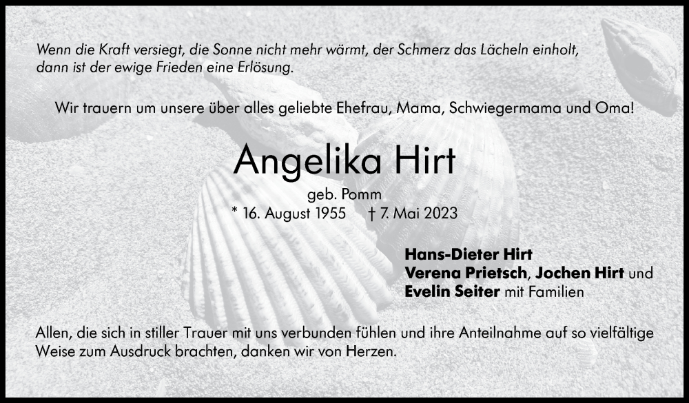 Hier finden Sie alle Traueranzeigen aus der Zeitung, die bisher für Angelika Hirt erschienen sind. Weitere Traueranzeigen, die in der Zeitung erscheinen, werden hier ebenfalls aufgelistet