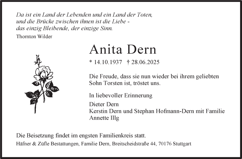 Hier finden Sie alle Traueranzeigen aus der Zeitung, die bisher für Anita Dern erschienen sind. Weitere Traueranzeigen, die in der Zeitung erscheinen, werden hier ebenfalls aufgelistet