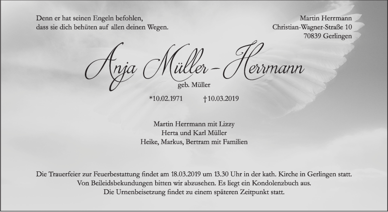 Hier finden Sie alle Traueranzeigen aus der Zeitung, die bisher für Anja Müller-Hermann erschienen sind. Weitere Traueranzeigen, die in der Zeitung erscheinen, werden hier ebenfalls aufgelistet