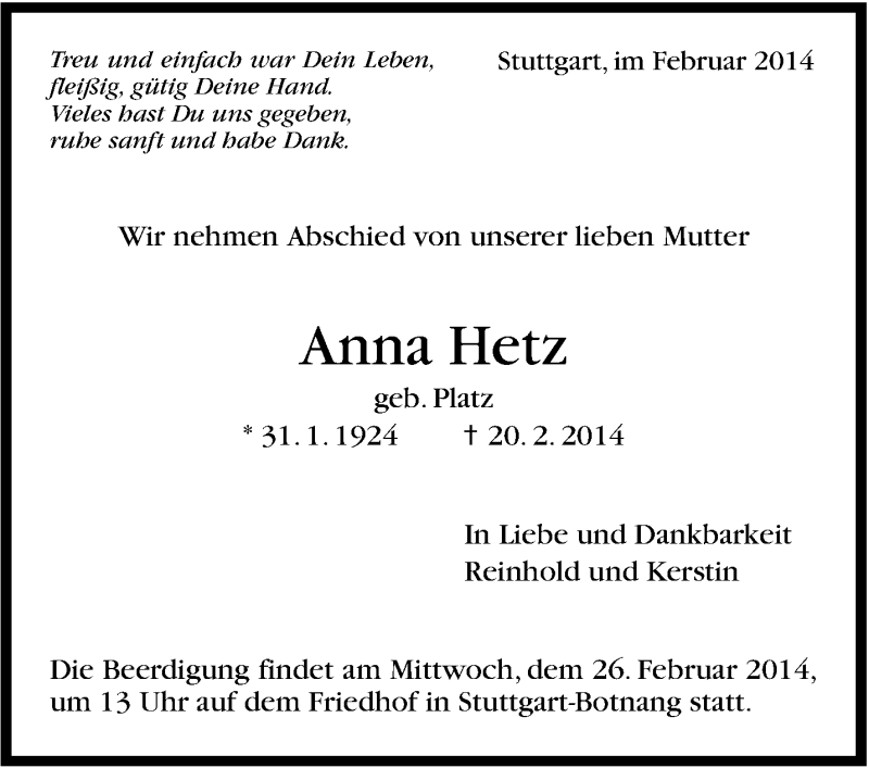 Hier finden Sie alle Traueranzeigen aus der Zeitung, die bisher für Anna Hetz erschienen sind. Weitere Traueranzeigen, die in der Zeitung erscheinen, werden hier ebenfalls aufgelistet