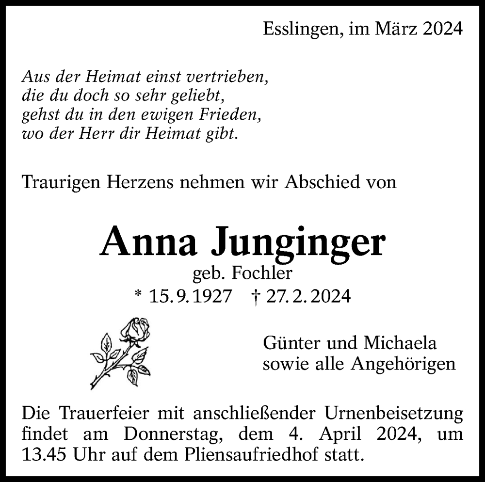 Hier finden Sie alle Traueranzeigen aus der Zeitung, die bisher für Anna Junginger erschienen sind. Weitere Traueranzeigen, die in der Zeitung erscheinen, werden hier ebenfalls aufgelistet