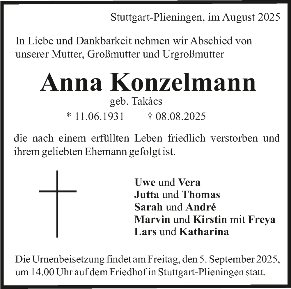 Hier finden Sie alle Traueranzeigen aus der Zeitung, die bisher für Anna Konzelmann erschienen sind. Weitere Traueranzeigen, die in der Zeitung erscheinen, werden hier ebenfalls aufgelistet