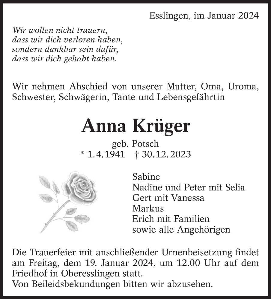 Hier finden Sie alle Traueranzeigen aus der Zeitung, die bisher für Anna Krüger erschienen sind. Weitere Traueranzeigen, die in der Zeitung erscheinen, werden hier ebenfalls aufgelistet