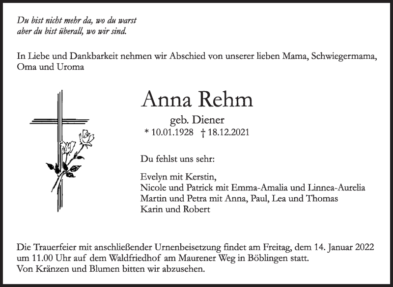 Hier finden Sie alle Traueranzeigen aus der Zeitung, die bisher für Anna Rehm erschienen sind. Weitere Traueranzeigen, die in der Zeitung erscheinen, werden hier ebenfalls aufgelistet