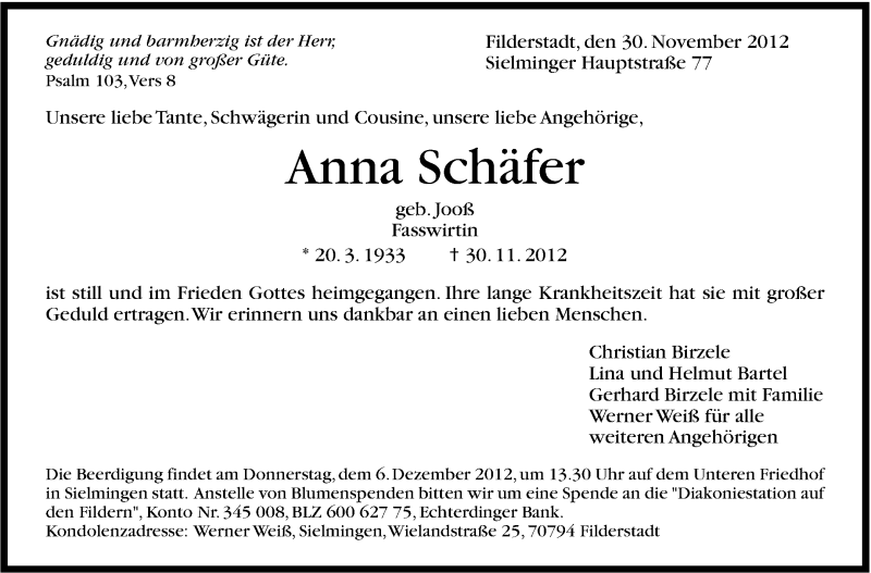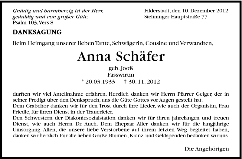 Hier finden Sie alle Traueranzeigen aus der Zeitung, die bisher für Anna Schäfer erschienen sind. Weitere Traueranzeigen, die in der Zeitung erscheinen, werden hier ebenfalls aufgelistet