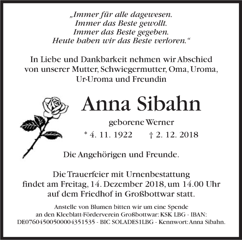 Hier finden Sie alle Traueranzeigen aus der Zeitung, die bisher für Anna Sibahn erschienen sind. Weitere Traueranzeigen, die in der Zeitung erscheinen, werden hier ebenfalls aufgelistet