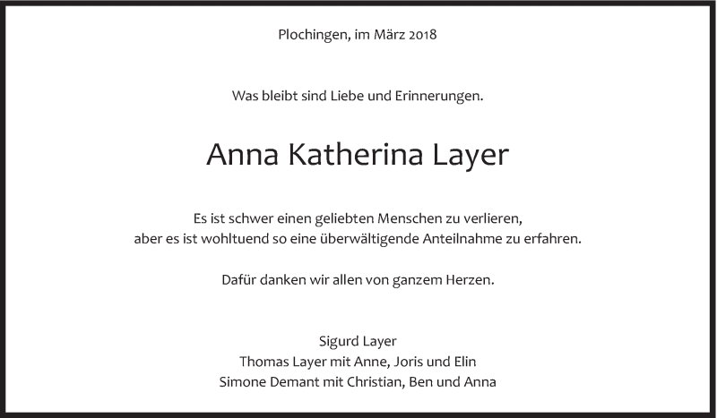 Hier finden Sie alle Traueranzeigen aus der Zeitung, die bisher für Anna Katherina Layer erschienen sind. Weitere Traueranzeigen, die in der Zeitung erscheinen, werden hier ebenfalls aufgelistet