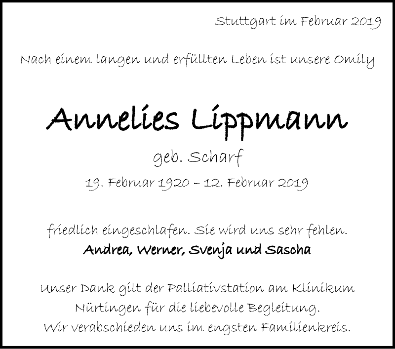 Hier finden Sie alle Traueranzeigen aus der Zeitung, die bisher für Annelies Lippmann erschienen sind. Weitere Traueranzeigen, die in der Zeitung erscheinen, werden hier ebenfalls aufgelistet