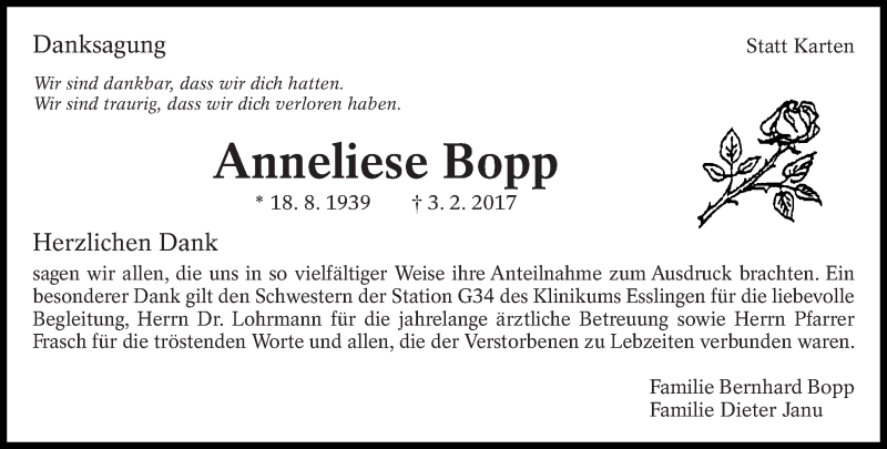 Hier finden Sie alle Traueranzeigen aus der Zeitung, die bisher für Anneliese Bopp erschienen sind. Weitere Traueranzeigen, die in der Zeitung erscheinen, werden hier ebenfalls aufgelistet