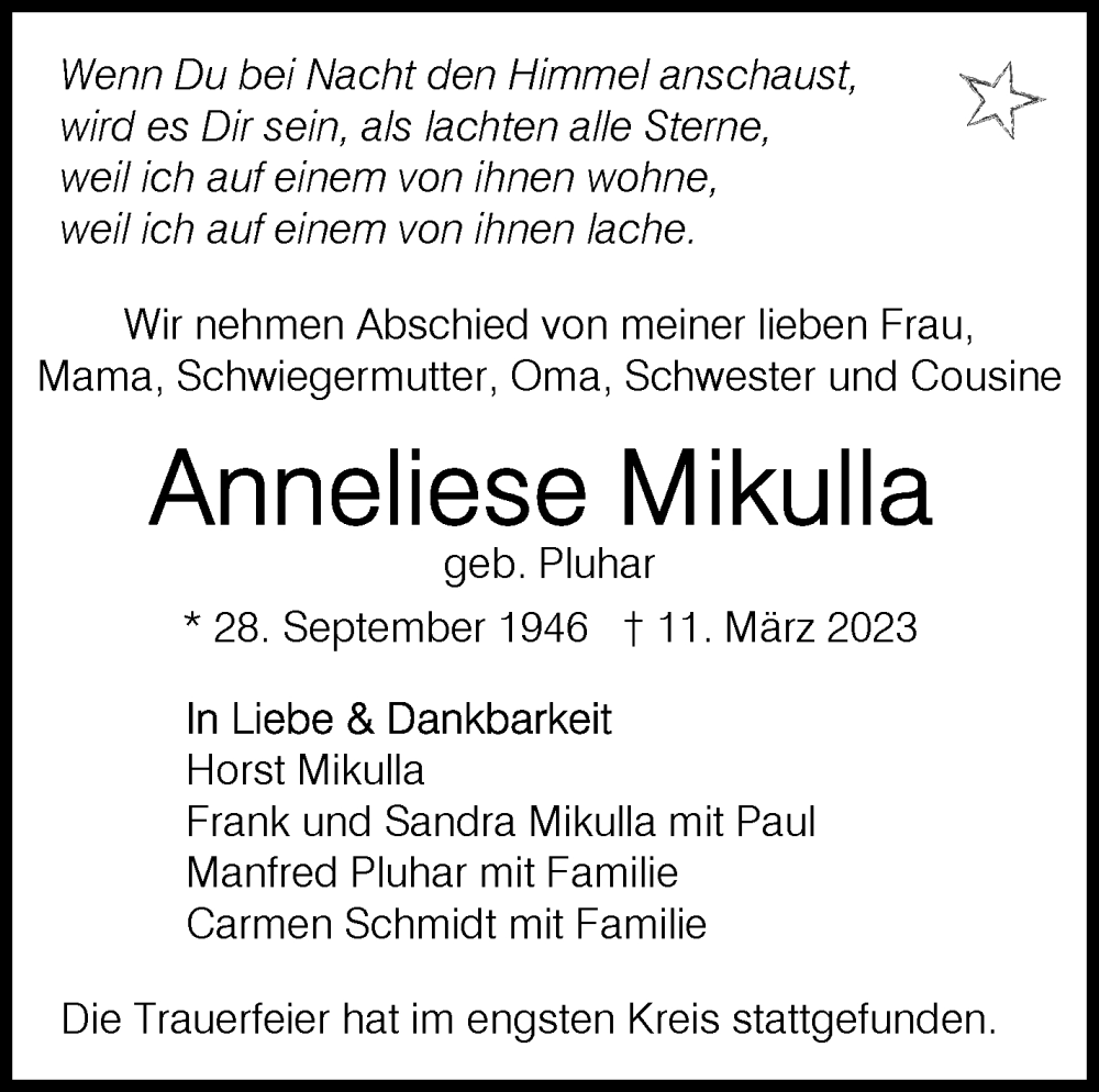 Hier finden Sie alle Traueranzeigen aus der Zeitung, die bisher für Anneliese Mikulla erschienen sind. Weitere Traueranzeigen, die in der Zeitung erscheinen, werden hier ebenfalls aufgelistet