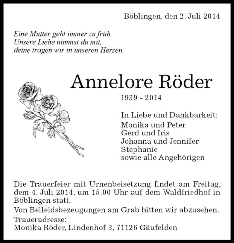Hier finden Sie alle Traueranzeigen aus der Zeitung, die bisher für Annelore Röder erschienen sind. Weitere Traueranzeigen, die in der Zeitung erscheinen, werden hier ebenfalls aufgelistet