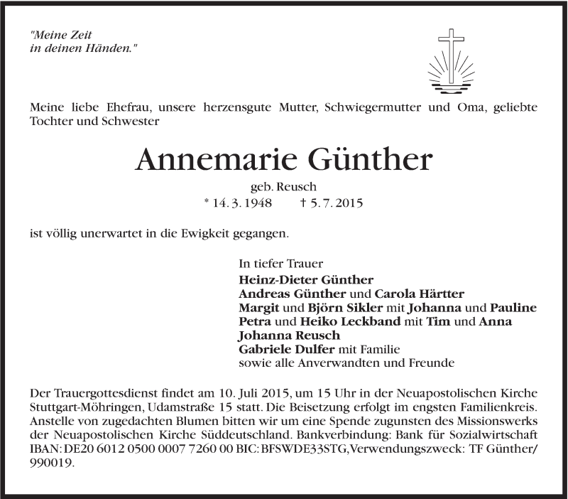 Hier finden Sie alle Traueranzeigen aus der Zeitung, die bisher für Annemarie Günther erschienen sind. Weitere Traueranzeigen, die in der Zeitung erscheinen, werden hier ebenfalls aufgelistet