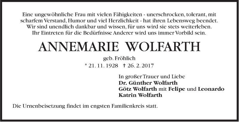 Hier finden Sie alle Traueranzeigen aus der Zeitung, die bisher für Annemarie Wolfarth erschienen sind. Weitere Traueranzeigen, die in der Zeitung erscheinen, werden hier ebenfalls aufgelistet
