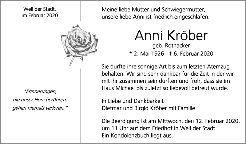 Hier finden Sie alle Traueranzeigen aus der Zeitung, die bisher für Anni Kröber erschienen sind. Weitere Traueranzeigen, die in der Zeitung erscheinen, werden hier ebenfalls aufgelistet