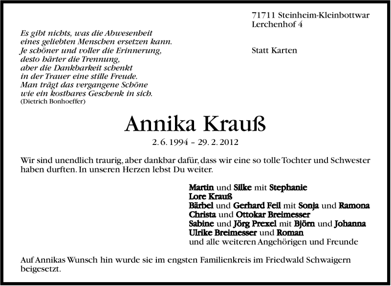 Hier finden Sie alle Traueranzeigen aus der Zeitung, die bisher für Annika Krauß erschienen sind. Weitere Traueranzeigen, die in der Zeitung erscheinen, werden hier ebenfalls aufgelistet