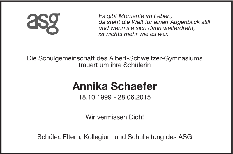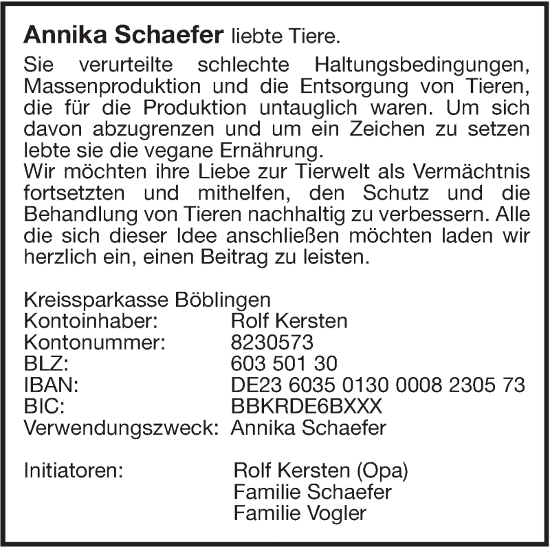 Hier finden Sie alle Traueranzeigen aus der Zeitung, die bisher für Annika Schaefer erschienen sind. Weitere Traueranzeigen, die in der Zeitung erscheinen, werden hier ebenfalls aufgelistet