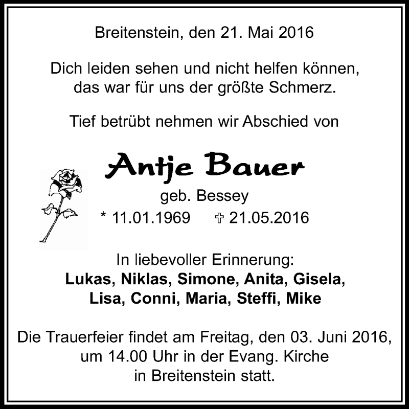 Hier finden Sie alle Traueranzeigen aus der Zeitung, die bisher für Antje Bauer erschienen sind. Weitere Traueranzeigen, die in der Zeitung erscheinen, werden hier ebenfalls aufgelistet
