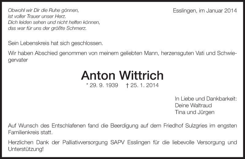 Hier finden Sie alle Traueranzeigen aus der Zeitung, die bisher für Anton Wittrich erschienen sind. Weitere Traueranzeigen, die in der Zeitung erscheinen, werden hier ebenfalls aufgelistet