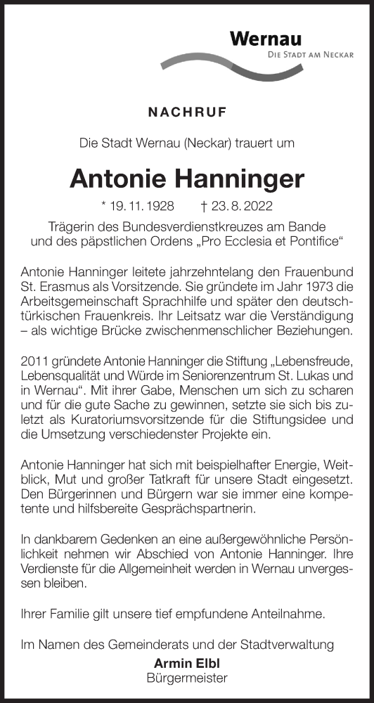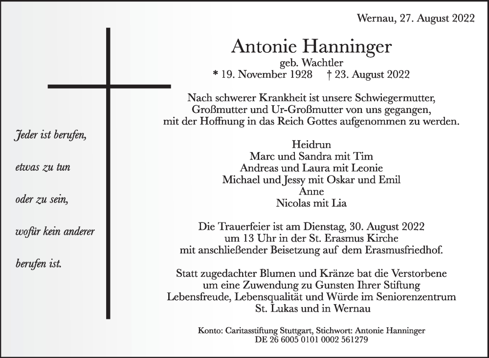 Hier finden Sie alle Traueranzeigen aus der Zeitung, die bisher für Antonie Hanninger erschienen sind. Weitere Traueranzeigen, die in der Zeitung erscheinen, werden hier ebenfalls aufgelistet