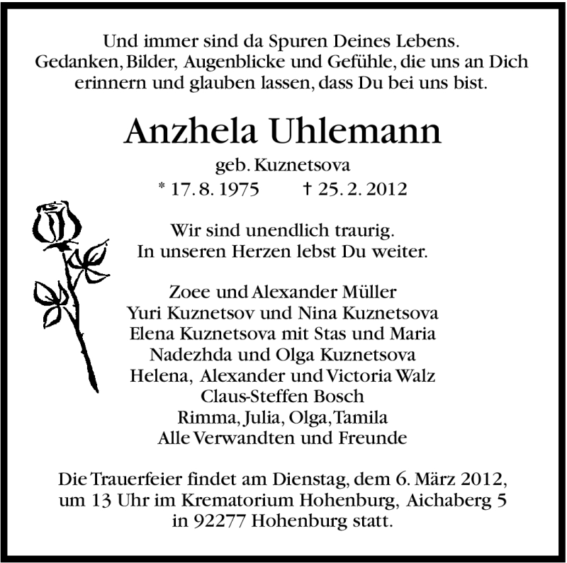 Hier finden Sie alle Traueranzeigen aus der Zeitung, die bisher für Anzhela Uhlemann erschienen sind. Weitere Traueranzeigen, die in der Zeitung erscheinen, werden hier ebenfalls aufgelistet