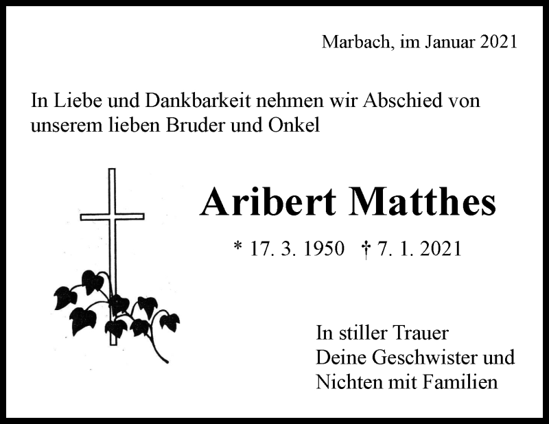 Hier finden Sie alle Traueranzeigen aus der Zeitung, die bisher für Aribert Matthes erschienen sind. Weitere Traueranzeigen, die in der Zeitung erscheinen, werden hier ebenfalls aufgelistet