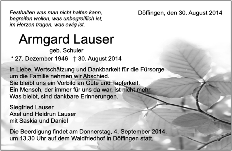 Hier finden Sie alle Traueranzeigen aus der Zeitung, die bisher für Armgard Lauser erschienen sind. Weitere Traueranzeigen, die in der Zeitung erscheinen, werden hier ebenfalls aufgelistet
