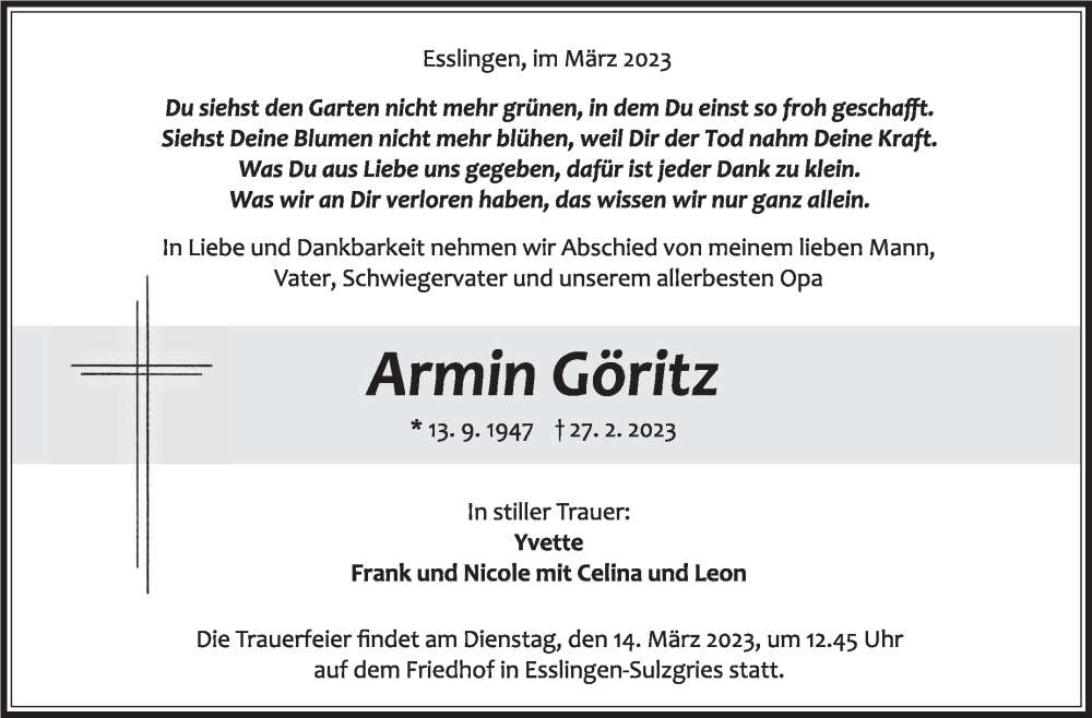 Hier finden Sie alle Traueranzeigen aus der Zeitung, die bisher für Armin Göritz erschienen sind. Weitere Traueranzeigen, die in der Zeitung erscheinen, werden hier ebenfalls aufgelistet