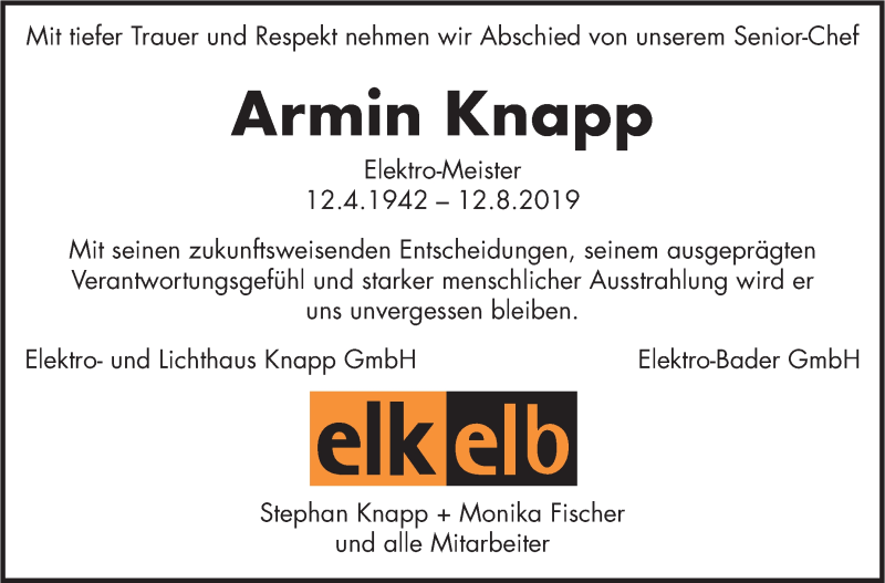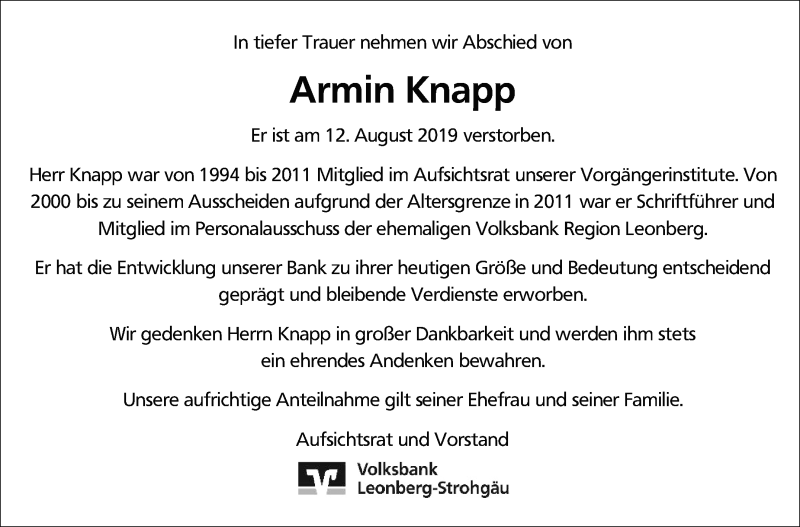 Hier finden Sie alle Traueranzeigen aus der Zeitung, die bisher für Armin Knapp erschienen sind. Weitere Traueranzeigen, die in der Zeitung erscheinen, werden hier ebenfalls aufgelistet