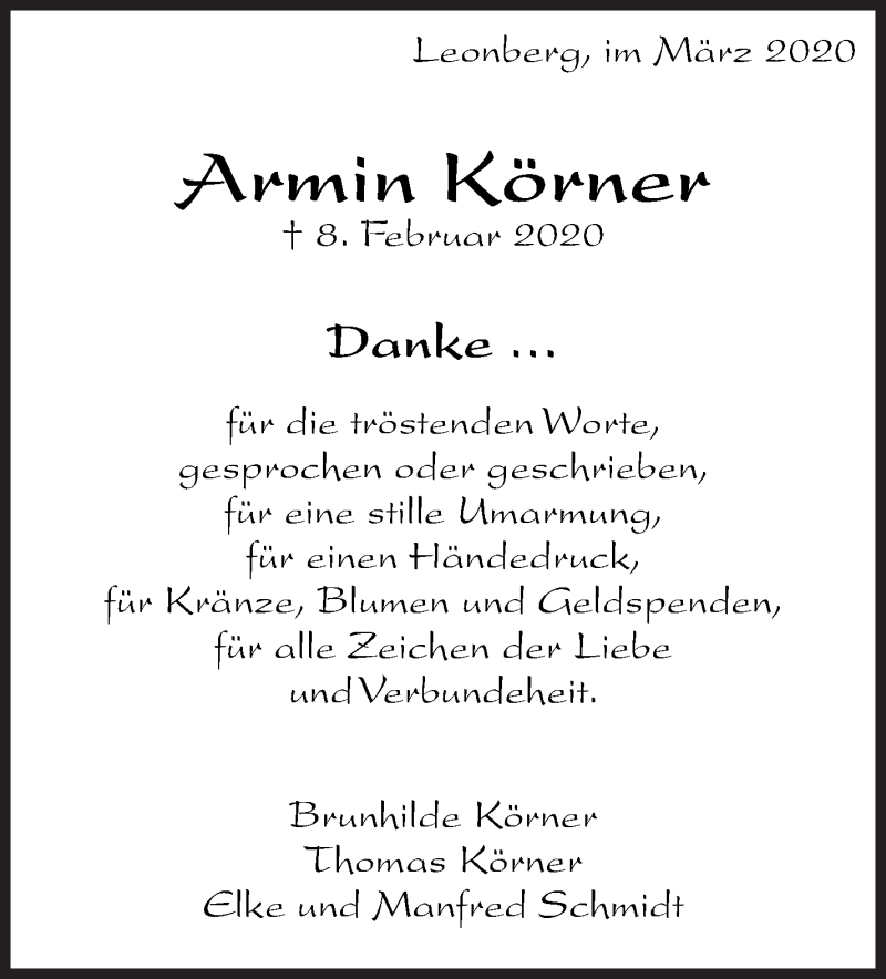 Hier finden Sie alle Traueranzeigen aus der Zeitung, die bisher für Armin Körner erschienen sind. Weitere Traueranzeigen, die in der Zeitung erscheinen, werden hier ebenfalls aufgelistet