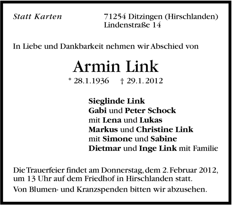 Hier finden Sie alle Traueranzeigen aus der Zeitung, die bisher für Armin Link erschienen sind. Weitere Traueranzeigen, die in der Zeitung erscheinen, werden hier ebenfalls aufgelistet