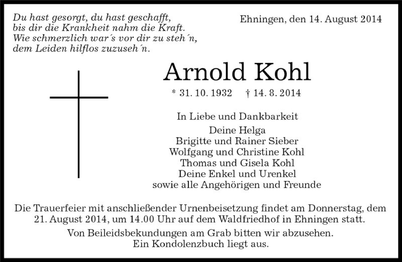 Hier finden Sie alle Traueranzeigen aus der Zeitung, die bisher für Arnold Kohl erschienen sind. Weitere Traueranzeigen, die in der Zeitung erscheinen, werden hier ebenfalls aufgelistet