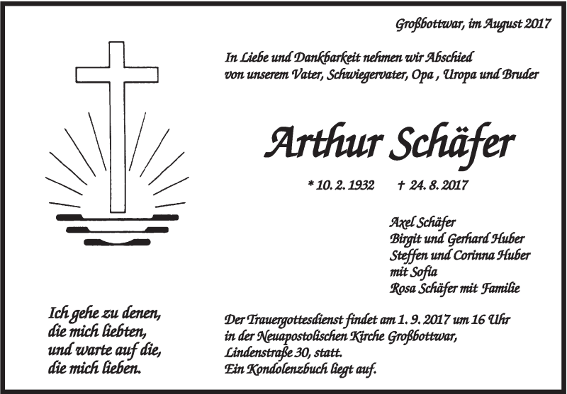 Hier finden Sie alle Traueranzeigen aus der Zeitung, die bisher für Arthur Schäfer erschienen sind. Weitere Traueranzeigen, die in der Zeitung erscheinen, werden hier ebenfalls aufgelistet
