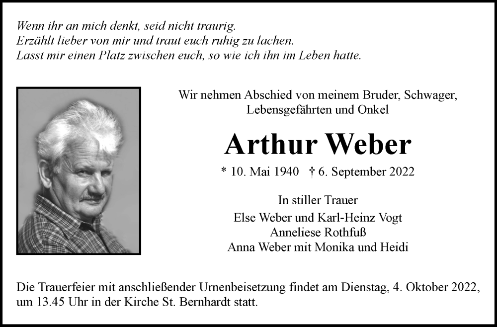 Hier finden Sie alle Traueranzeigen aus der Zeitung, die bisher für Arthur Weber erschienen sind. Weitere Traueranzeigen, die in der Zeitung erscheinen, werden hier ebenfalls aufgelistet
