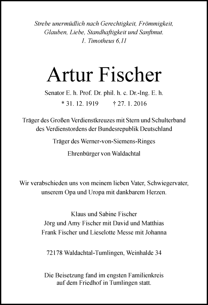 Hier finden Sie alle Traueranzeigen aus der Zeitung, die bisher für Artur Fischer erschienen sind. Weitere Traueranzeigen, die in der Zeitung erscheinen, werden hier ebenfalls aufgelistet