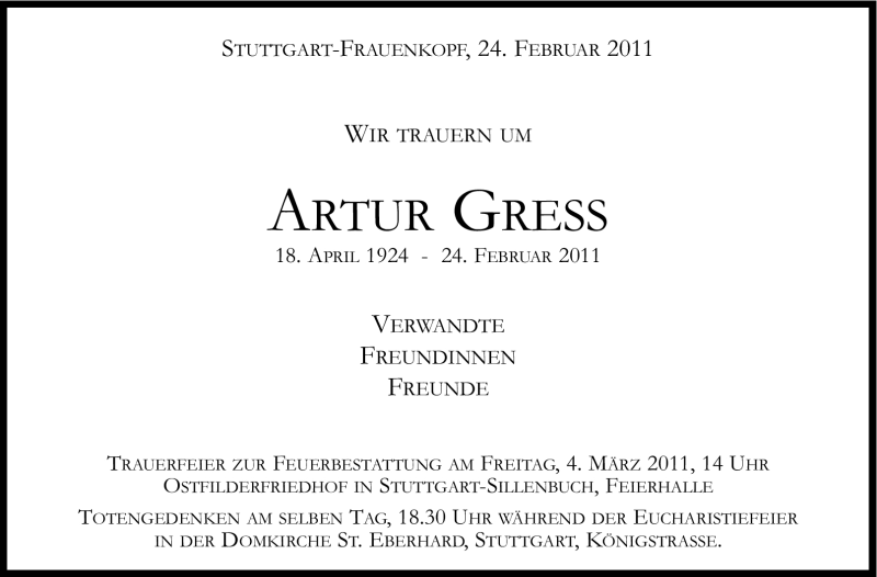 Hier finden Sie alle Traueranzeigen aus der Zeitung, die bisher für Artur Gress erschienen sind. Weitere Traueranzeigen, die in der Zeitung erscheinen, werden hier ebenfalls aufgelistet