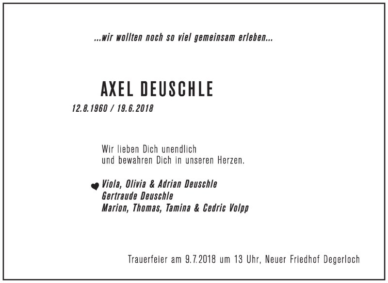 Hier finden Sie alle Traueranzeigen aus der Zeitung, die bisher für Axel Deuschle erschienen sind. Weitere Traueranzeigen, die in der Zeitung erscheinen, werden hier ebenfalls aufgelistet