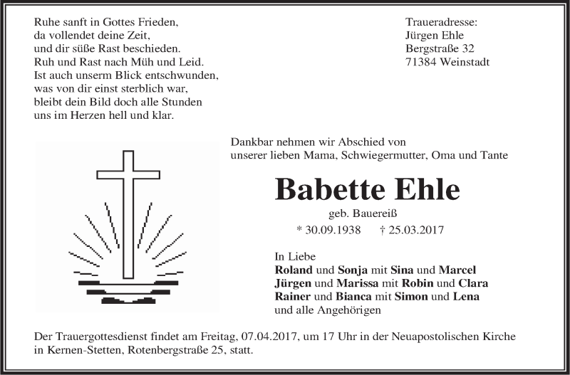 Hier finden Sie alle Traueranzeigen aus der Zeitung, die bisher für Babette Ehle erschienen sind. Weitere Traueranzeigen, die in der Zeitung erscheinen, werden hier ebenfalls aufgelistet