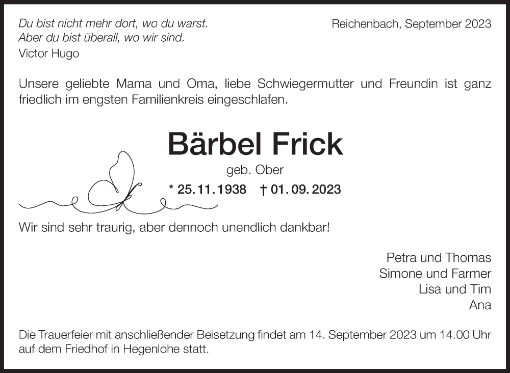 Hier finden Sie alle Traueranzeigen aus der Zeitung, die bisher für Bärbel Frick erschienen sind. Weitere Traueranzeigen, die in der Zeitung erscheinen, werden hier ebenfalls aufgelistet