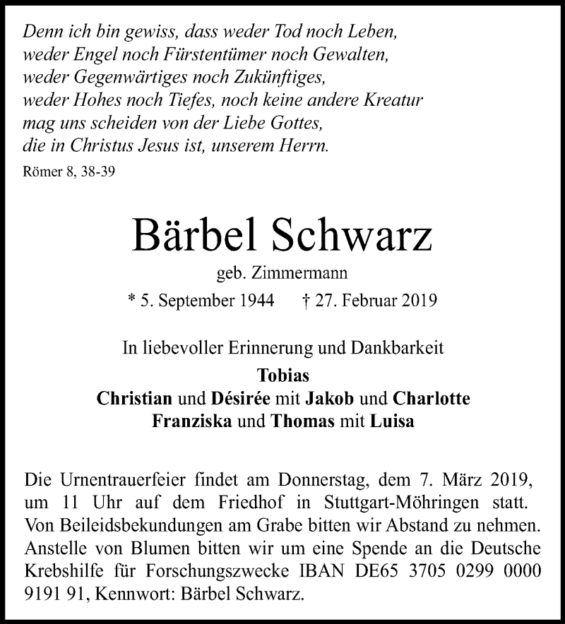 Hier finden Sie alle Traueranzeigen aus der Zeitung, die bisher für Bärbel Schwarz erschienen sind. Weitere Traueranzeigen, die in der Zeitung erscheinen, werden hier ebenfalls aufgelistet