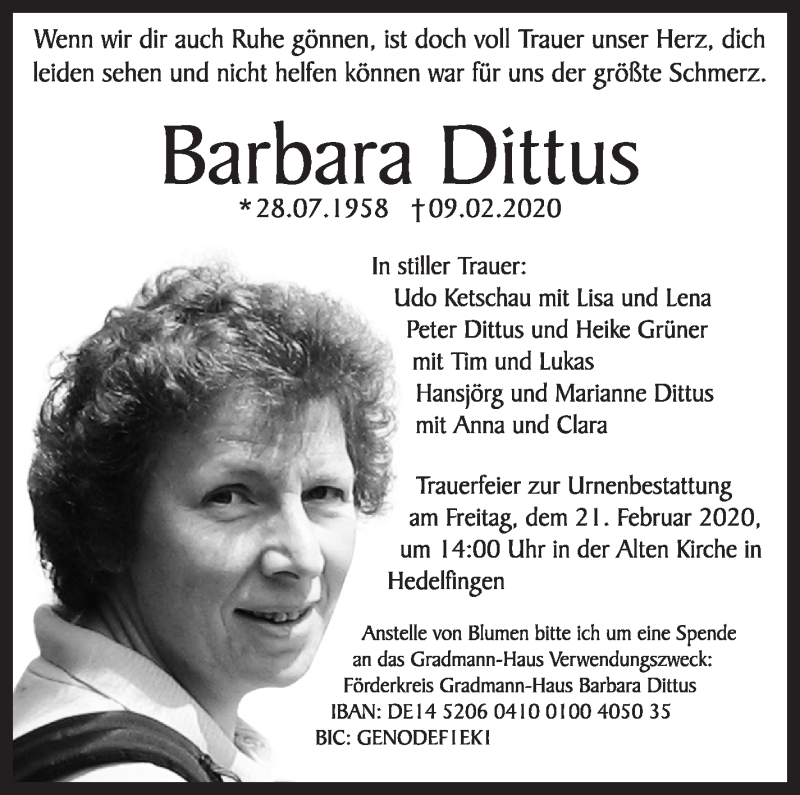 Hier finden Sie alle Traueranzeigen aus der Zeitung, die bisher für Barbara Dittus erschienen sind. Weitere Traueranzeigen, die in der Zeitung erscheinen, werden hier ebenfalls aufgelistet