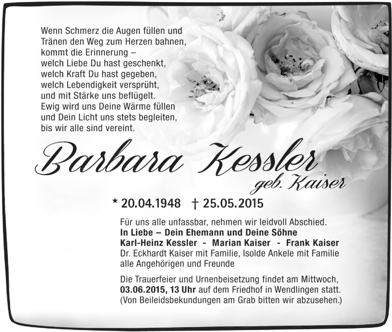 Hier finden Sie alle Traueranzeigen aus der Zeitung, die bisher für Barbara Kessler erschienen sind. Weitere Traueranzeigen, die in der Zeitung erscheinen, werden hier ebenfalls aufgelistet