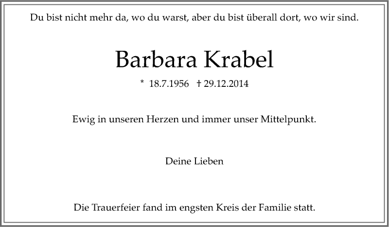 Hier finden Sie alle Traueranzeigen aus der Zeitung, die bisher für Barbara Krabel erschienen sind. Weitere Traueranzeigen, die in der Zeitung erscheinen, werden hier ebenfalls aufgelistet