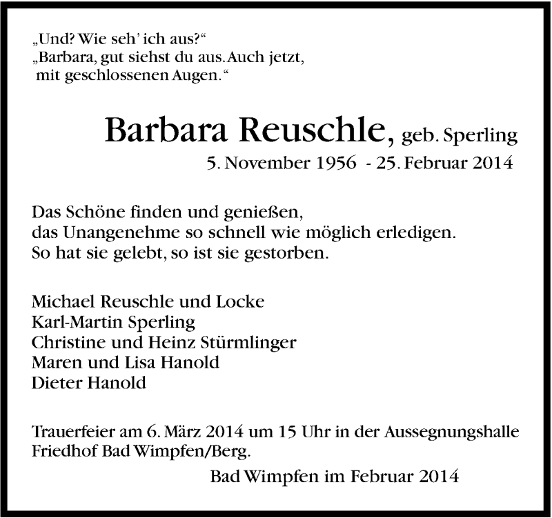 Hier finden Sie alle Traueranzeigen aus der Zeitung, die bisher für Barbara Reuschle erschienen sind. Weitere Traueranzeigen, die in der Zeitung erscheinen, werden hier ebenfalls aufgelistet