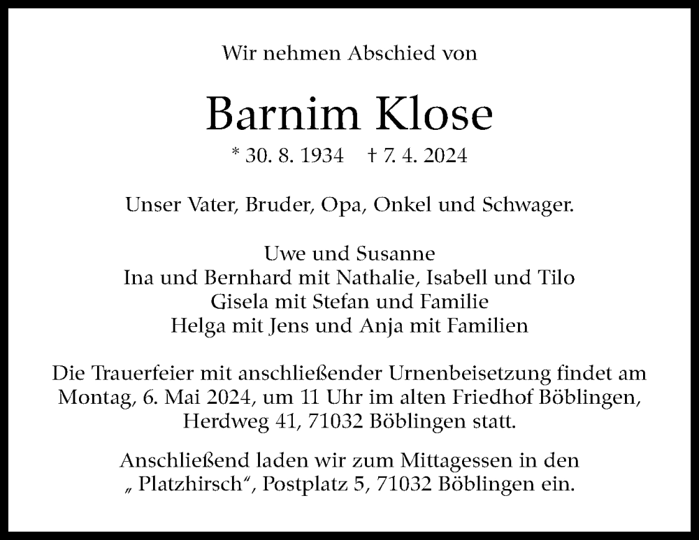 Hier finden Sie alle Traueranzeigen aus der Zeitung, die bisher für Barnim Klose erschienen sind. Weitere Traueranzeigen, die in der Zeitung erscheinen, werden hier ebenfalls aufgelistet