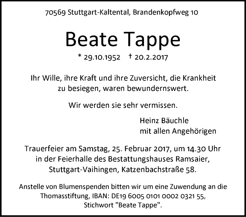 Hier finden Sie alle Traueranzeigen aus der Zeitung, die bisher für Beate Tappe erschienen sind. Weitere Traueranzeigen, die in der Zeitung erscheinen, werden hier ebenfalls aufgelistet