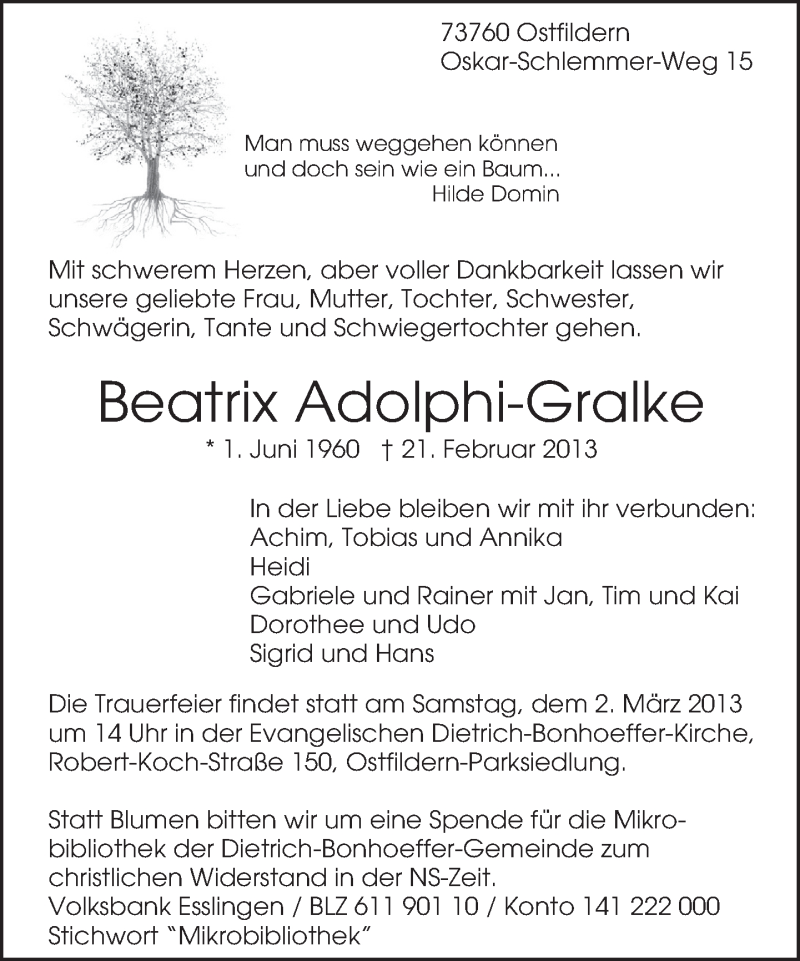 Hier finden Sie alle Traueranzeigen aus der Zeitung, die bisher für Beatrix Adolphi-Gralke erschienen sind. Weitere Traueranzeigen, die in der Zeitung erscheinen, werden hier ebenfalls aufgelistet