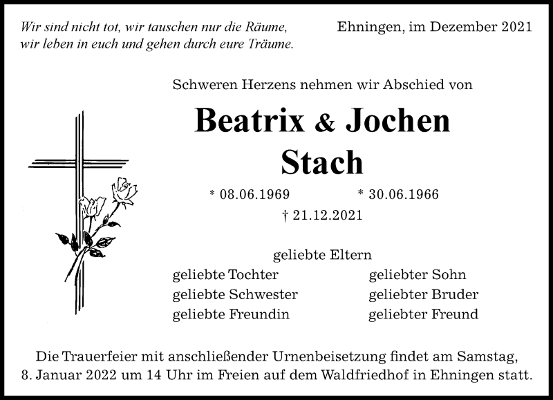 Hier finden Sie alle Traueranzeigen aus der Zeitung, die bisher für Beatrix und Jochen Stach erschienen sind. Weitere Traueranzeigen, die in der Zeitung erscheinen, werden hier ebenfalls aufgelistet