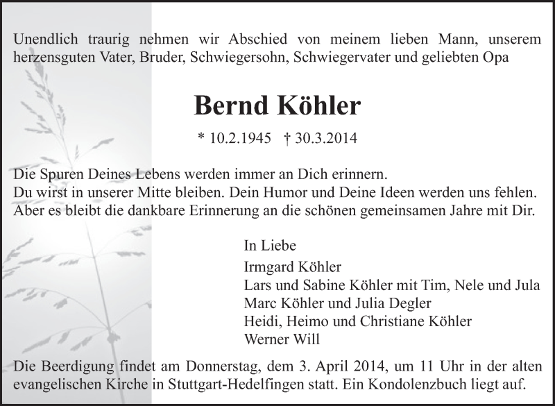 Hier finden Sie alle Traueranzeigen aus der Zeitung, die bisher für Bernd Köhler erschienen sind. Weitere Traueranzeigen, die in der Zeitung erscheinen, werden hier ebenfalls aufgelistet