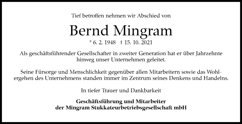 Hier finden Sie alle Traueranzeigen aus der Zeitung, die bisher für Bernd Mingram erschienen sind. Weitere Traueranzeigen, die in der Zeitung erscheinen, werden hier ebenfalls aufgelistet